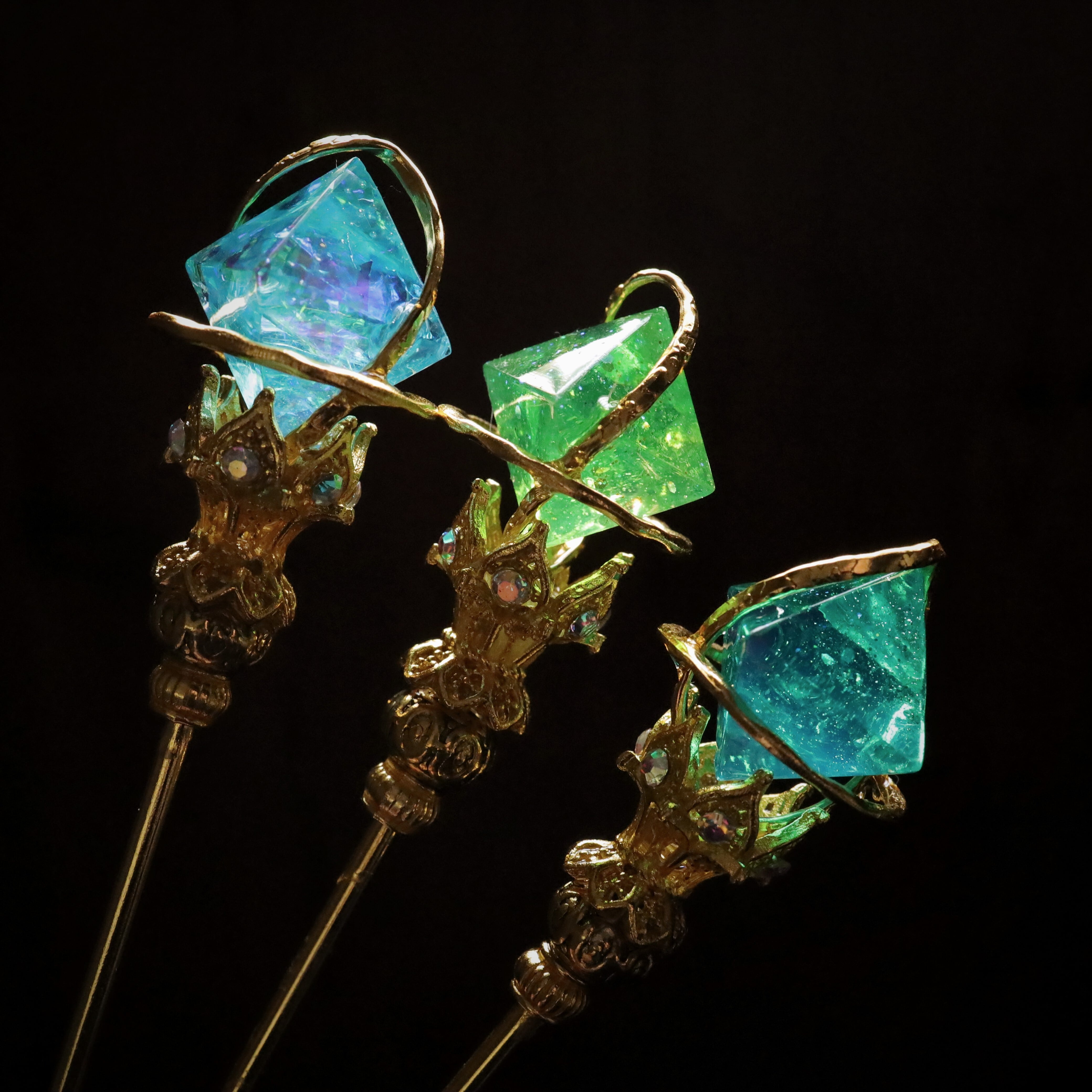 錬金術師達により錬成された不思議な魔石をはめ込んだ杖をイメージした簪。