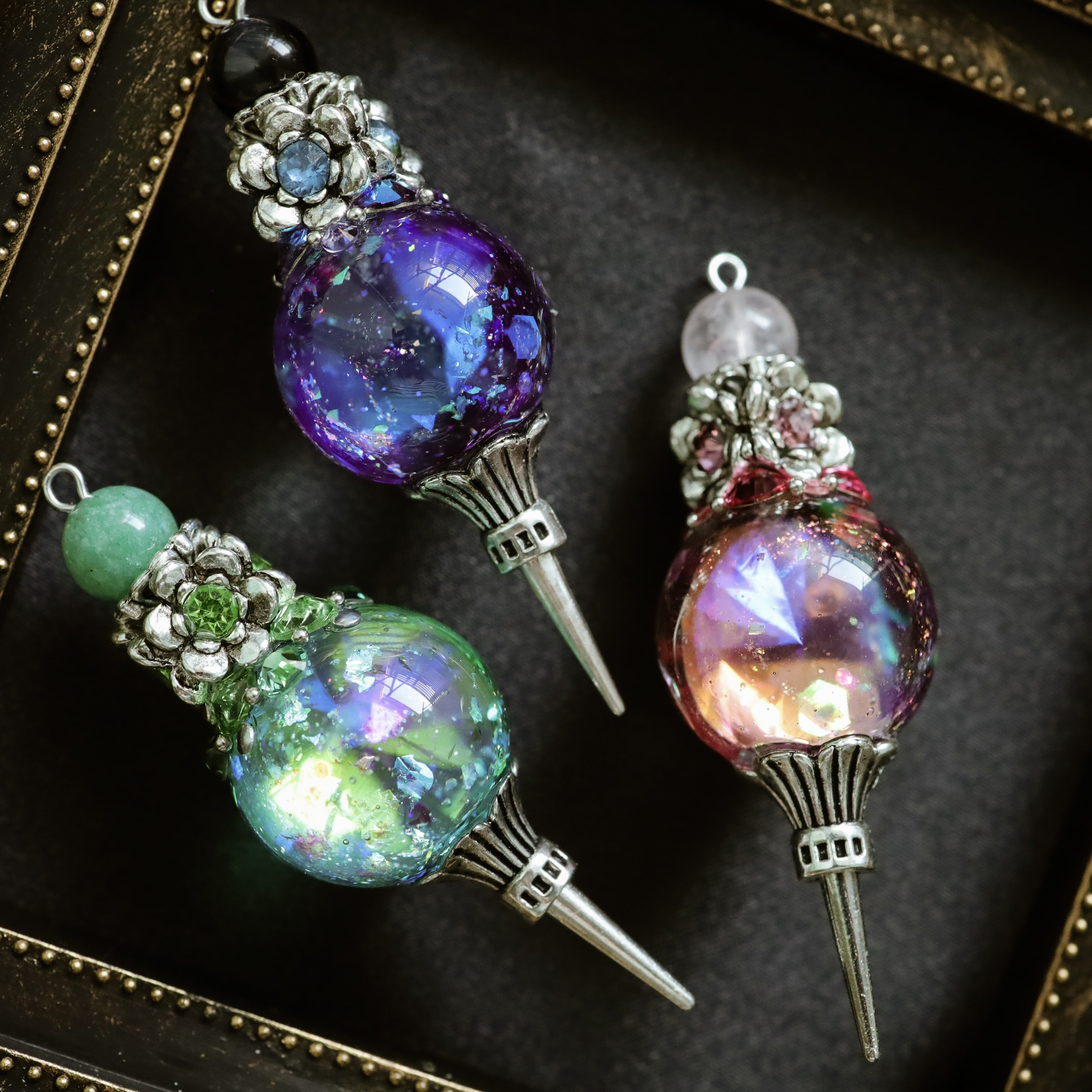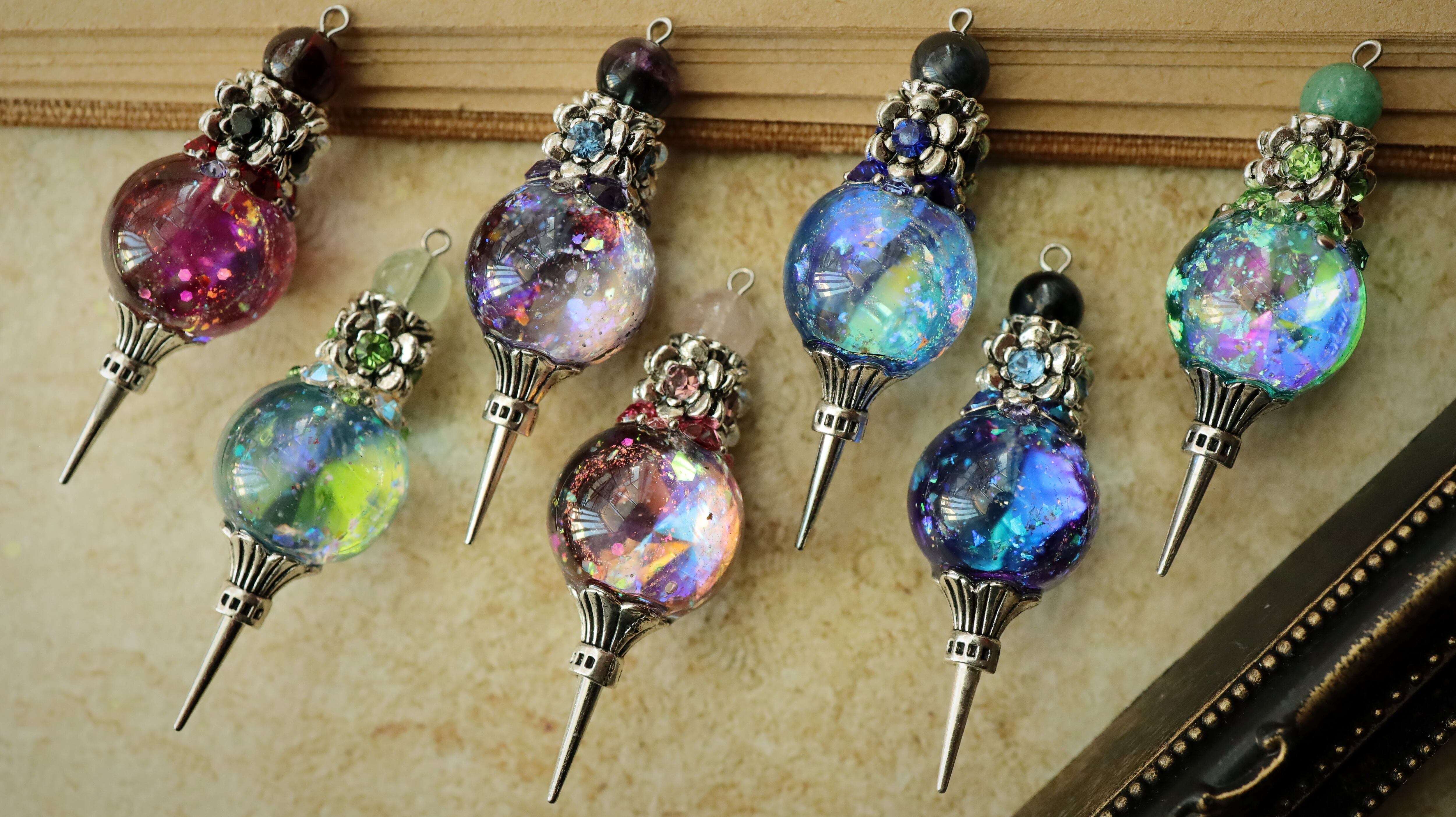 素材:レジン、合金、ウッドビーズ、スワロフスキー、革紐、天然石