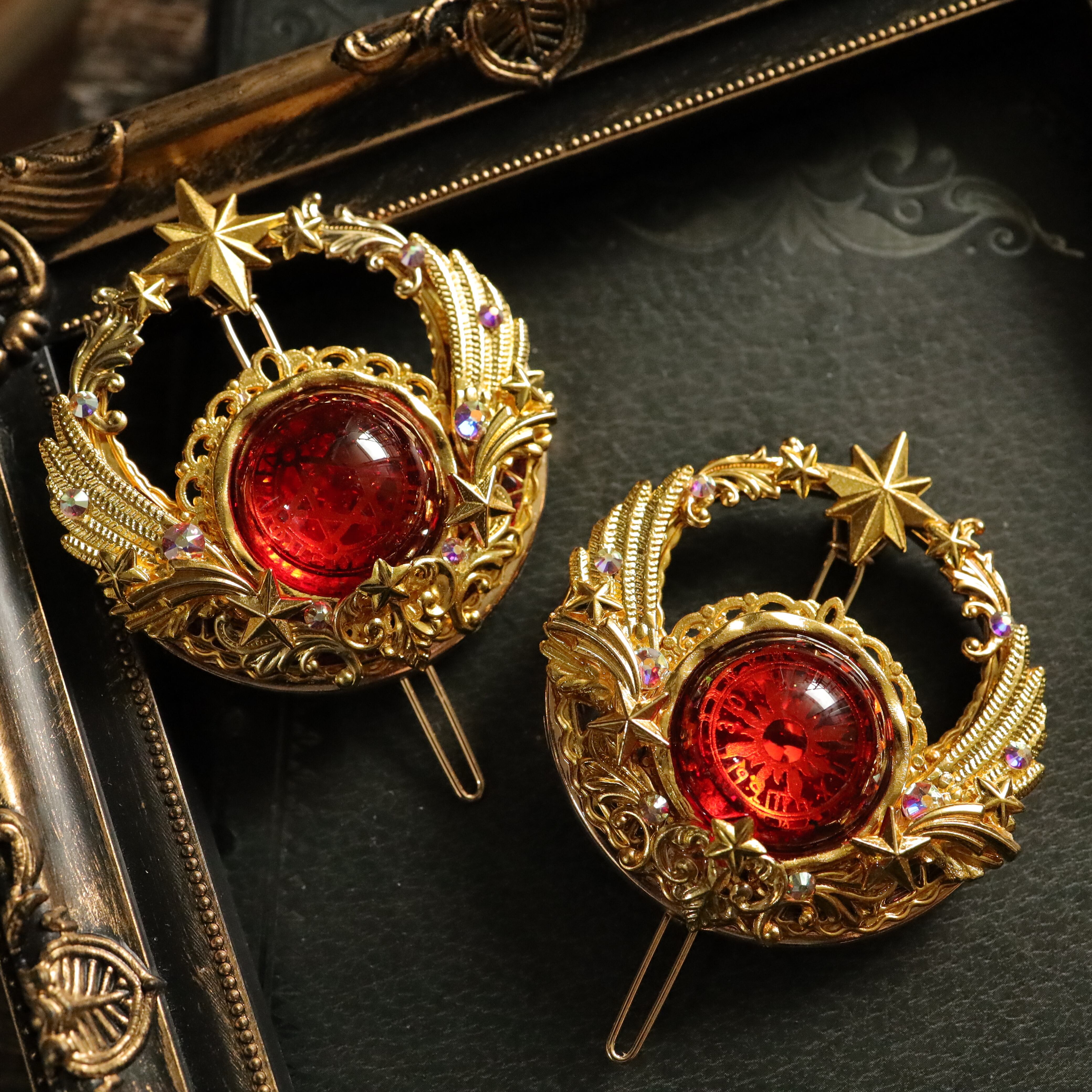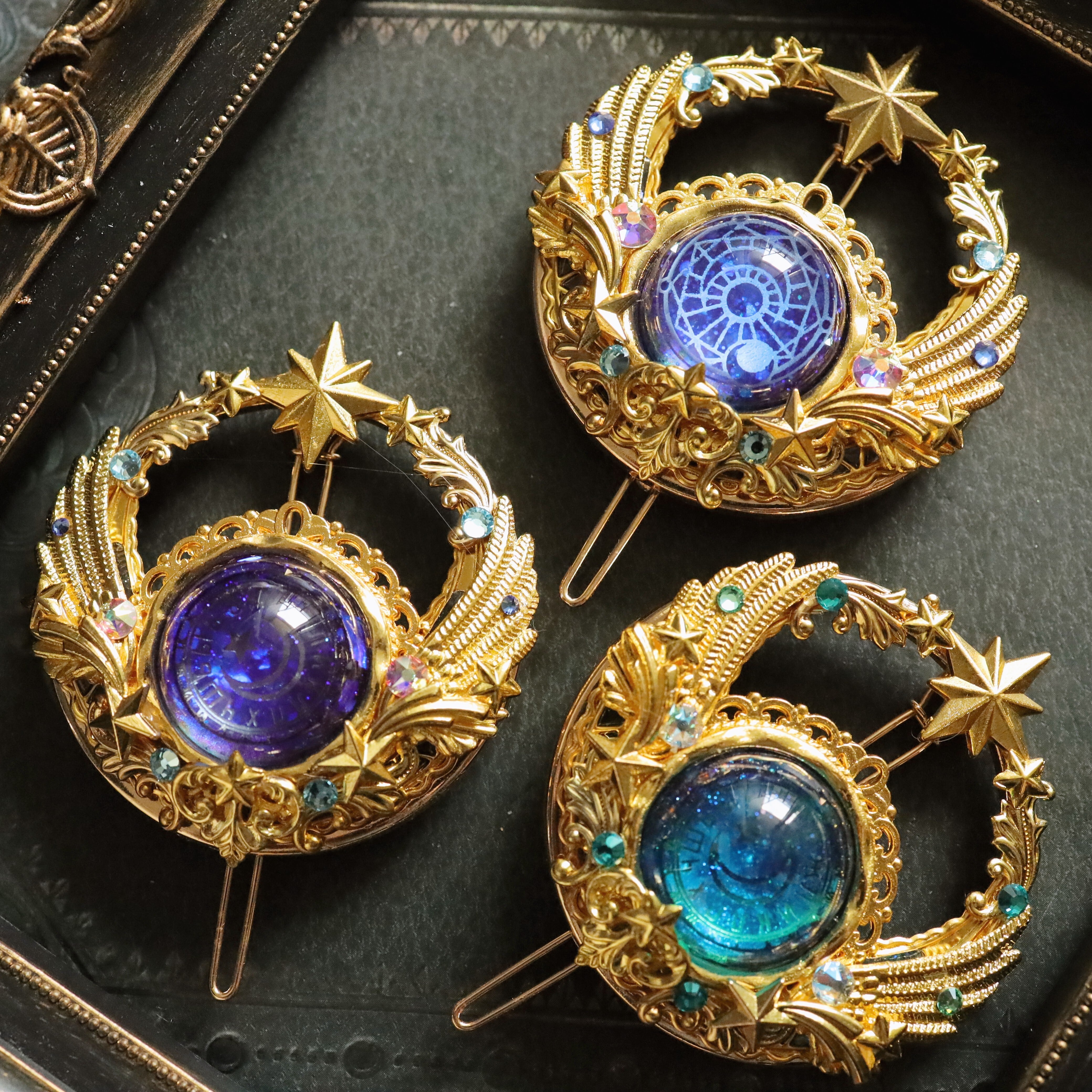 三日月と翼と星のモチーフにスワロフスキーや魔法珠を散りばめたヘアクリップです、